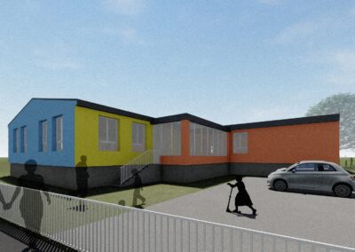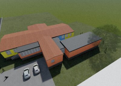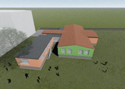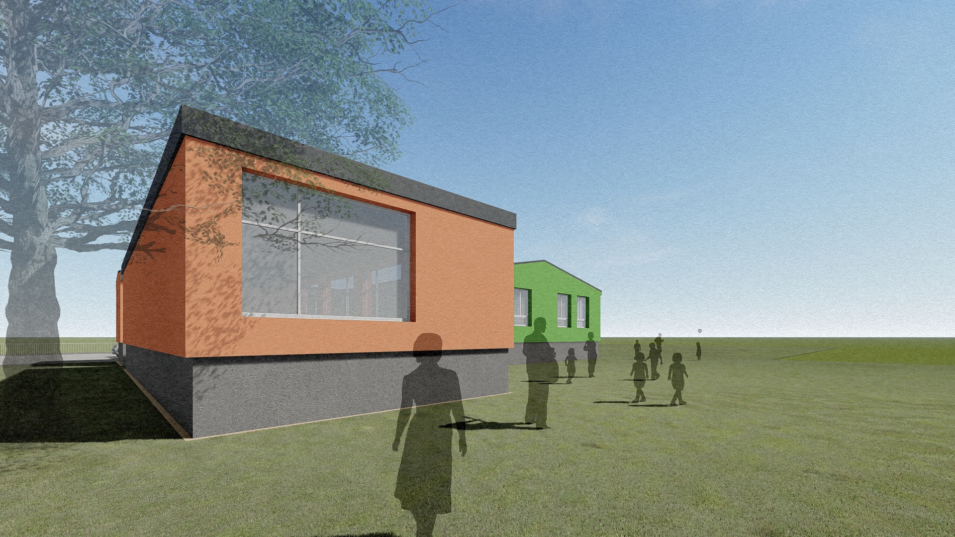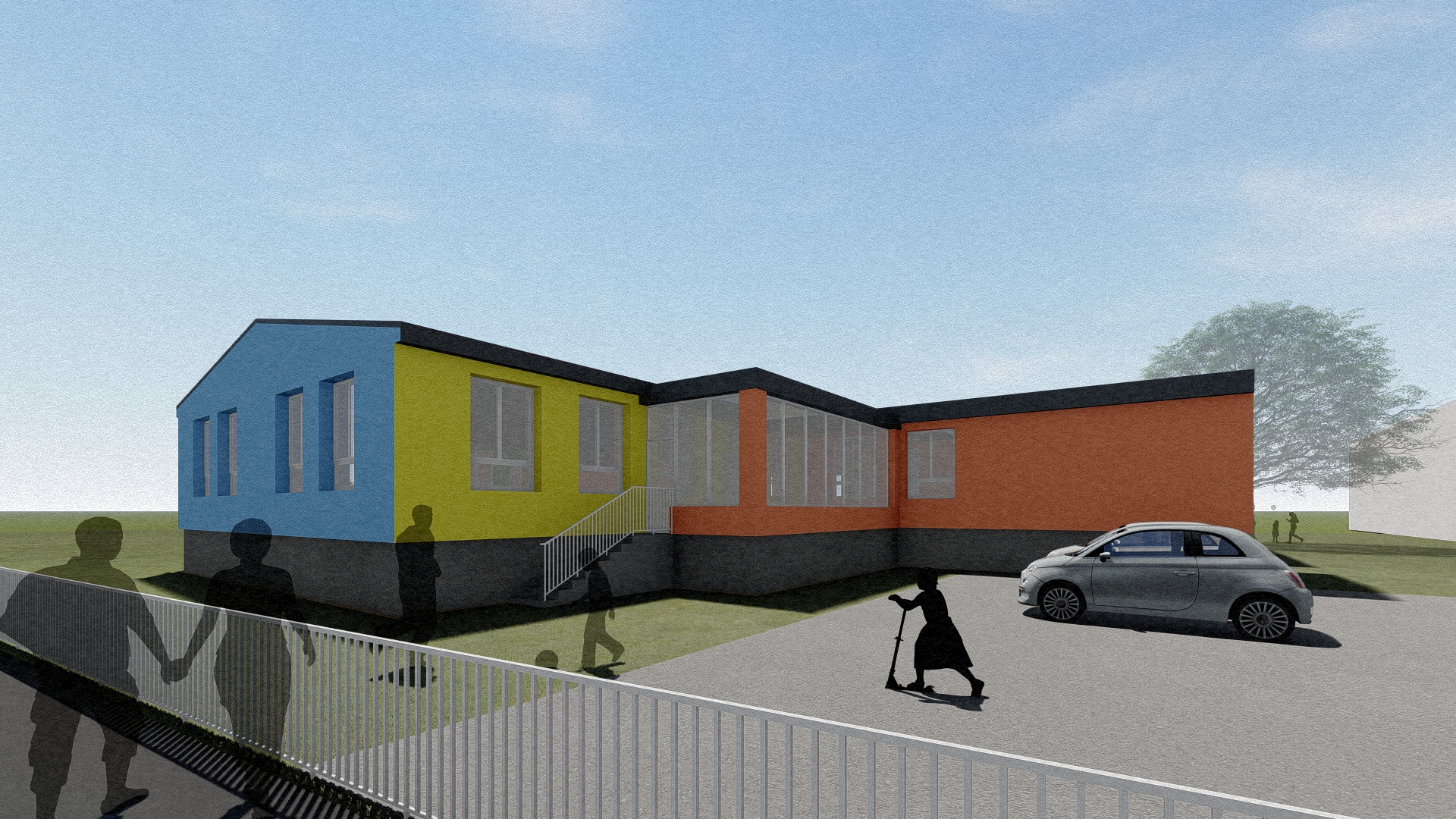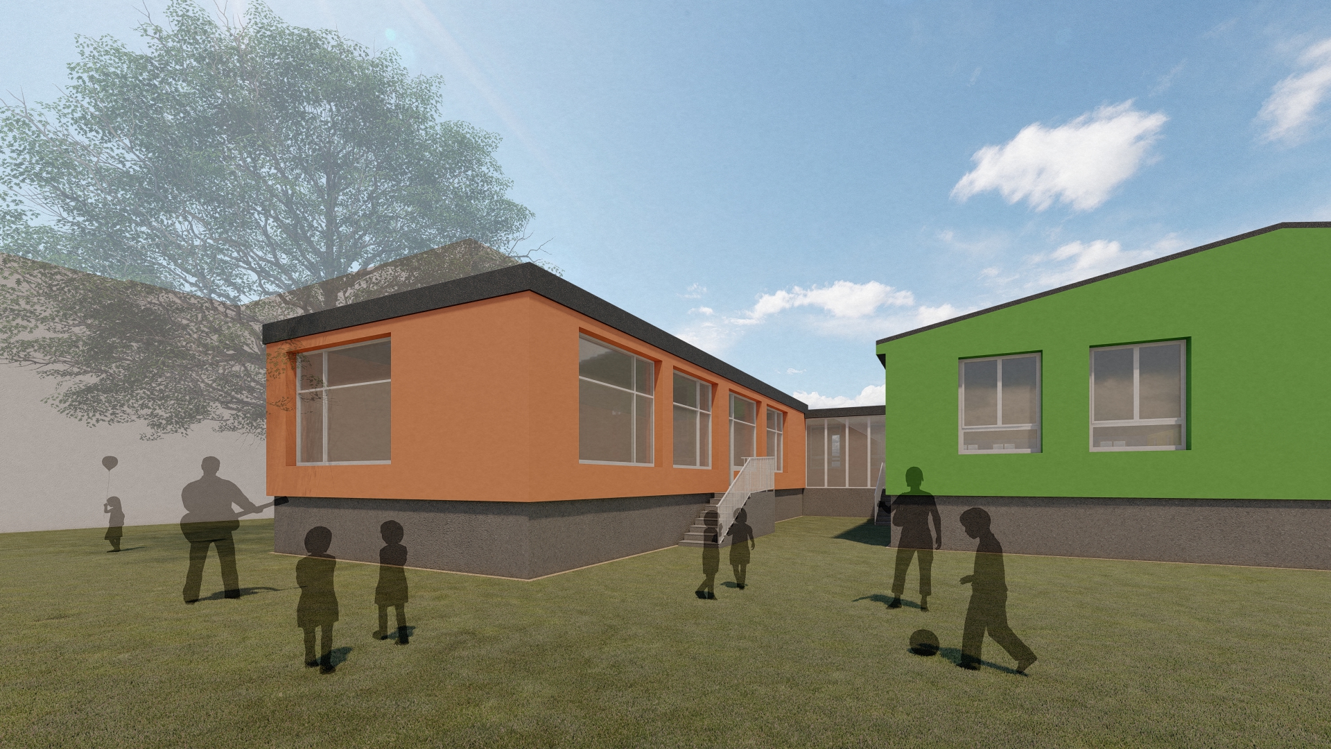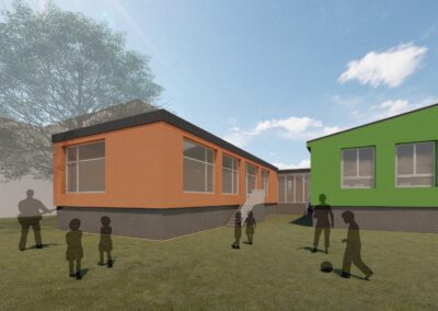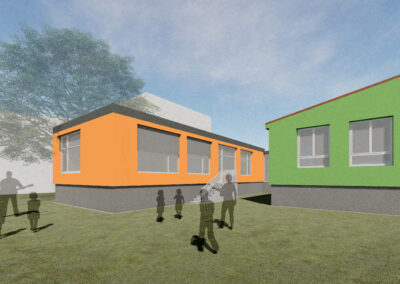 Stávající mateřská školka svou kapacitou nevyhovovala a zadáním bylo přistavět novou třídu z kontejnerů s co nejmenšími zásahy do stávající budovy, která byla nedávno opravena.
