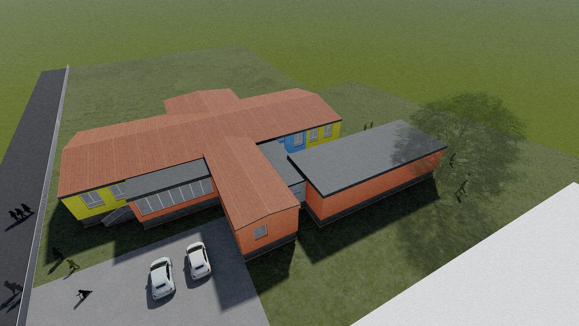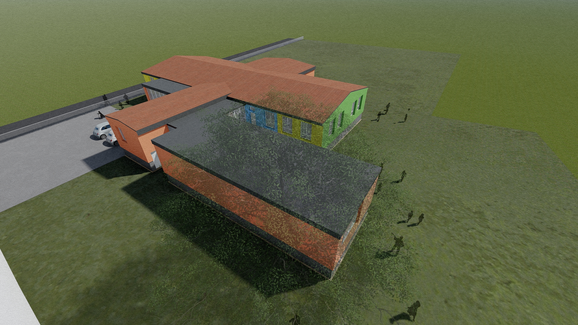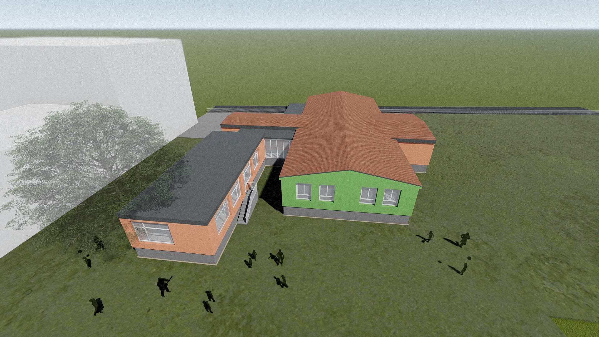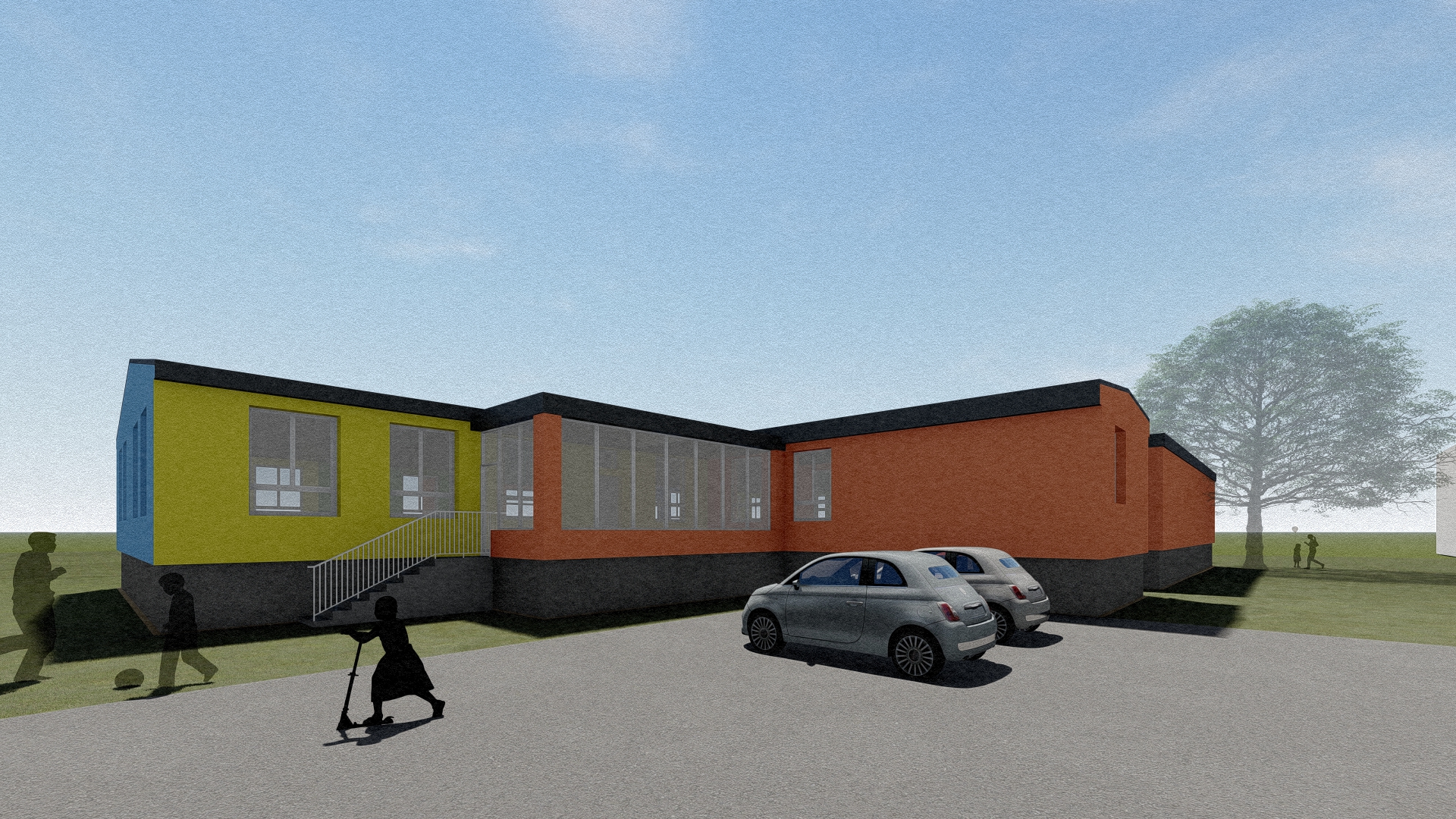 Stávající mateřská školka svou kapacitou nevyhovovala a zadáním bylo přistavět novou třídu z kontejnerů s co nejmenšími zásahy do stávající budovy, která byla nedávno opravena.